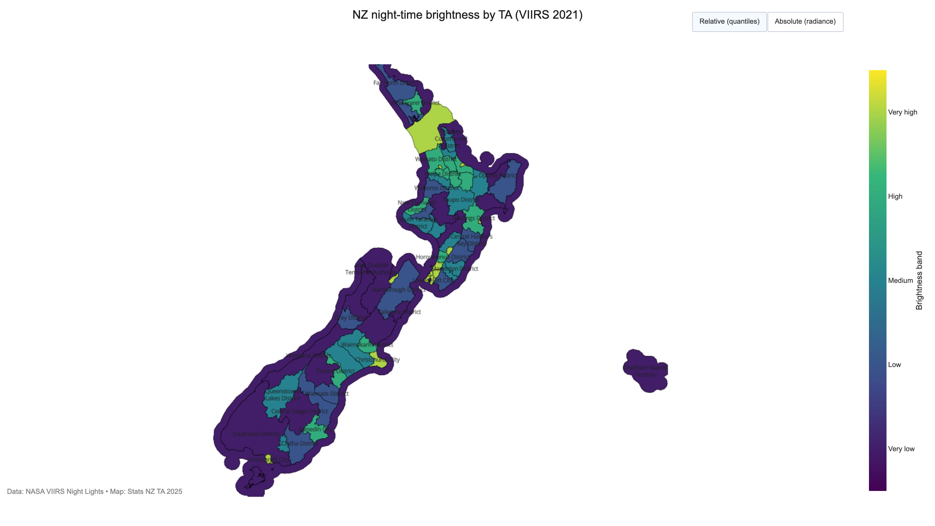 Interactive choropleth of average night-time radiance across New Zealand’s Territorial Authorities (VIIRS, 2021).